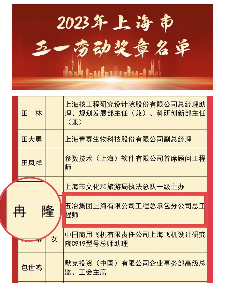 4月27日,2023年上海市五一劳动奖表彰大会在上海友谊会堂隆重举行,五冶集团上海有限公司工程总承包分公司总工程师冉隆同志荣获上海市五一劳动奖章。